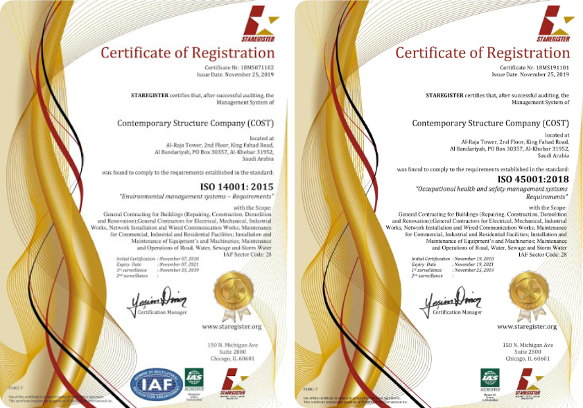 We are certified with OSHAS18001:2007 and ISO14001:2015 to improve safety in the workplace.